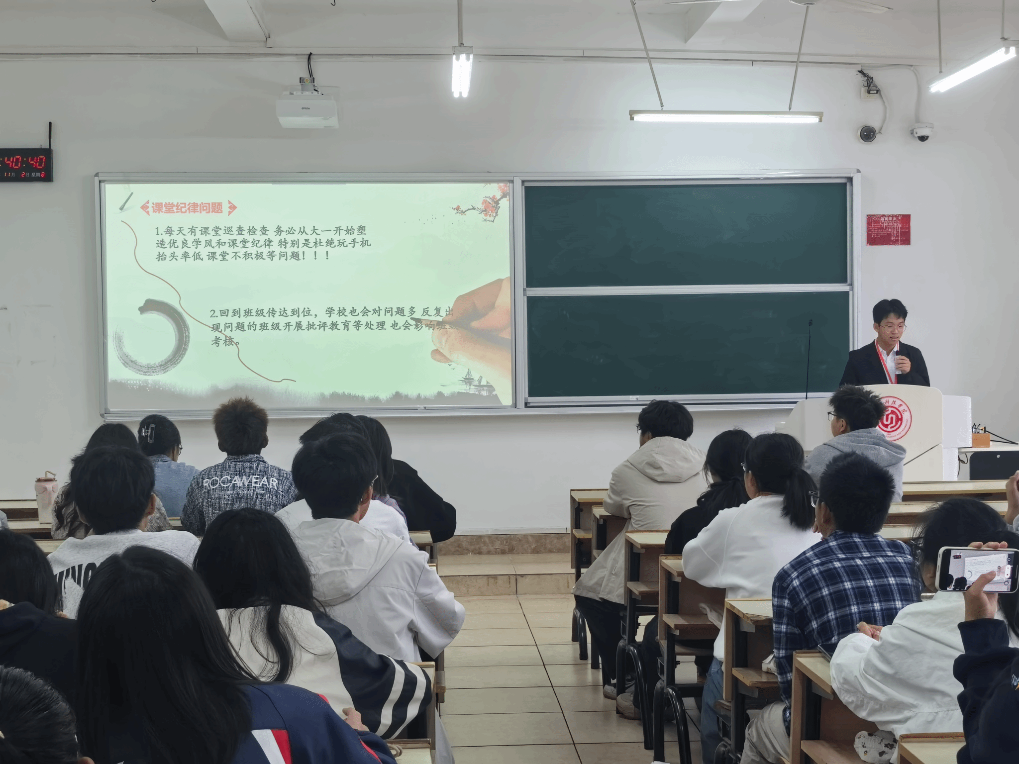 会议分别从学生评教工作的重要意义、网上评教的具体操作、网上评教的注意事项及工作要求等四个方面进行了系统的培训,并且现场演示了网上评教的操作步骤,同时还开展了纪律主题宣传,对评教中心日常课堂教学检查中发现的问题进行了提醒反馈,要求各班学委在班上做好课堂纪律意识的宣传,切保学风的持续提升。